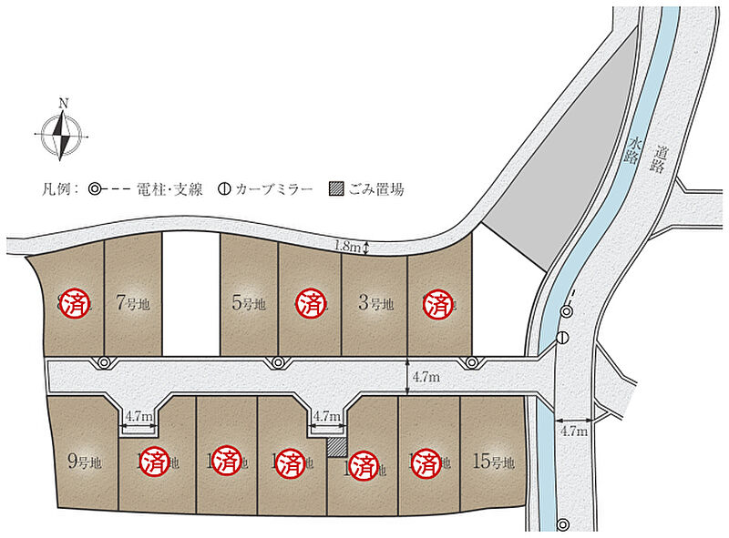 | 駐車場 | - | 道路の幅員 | 道路幅:4.7m/道路幅の備考:分譲地北側道路は建築基準法第42条の道路に該当しません。 |