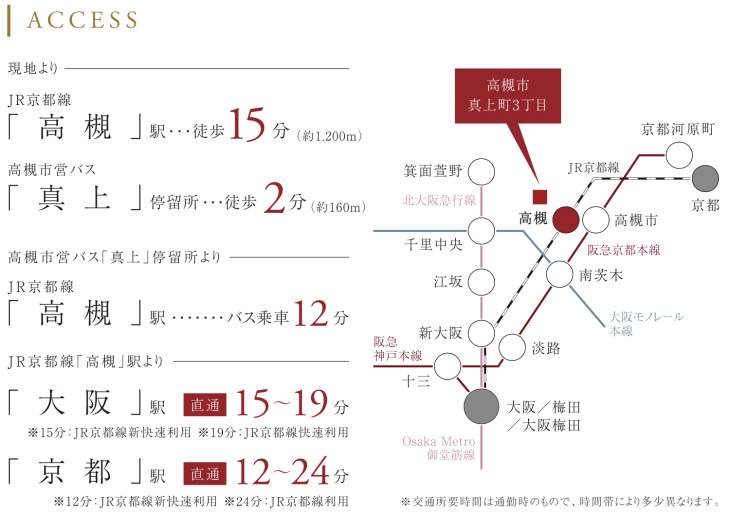 JR東海道・山陽本線「高槻」駅 徒歩15分 JR東海道・山陽本線「高槻」駅 バス 12分 真上 徒歩2分 |
