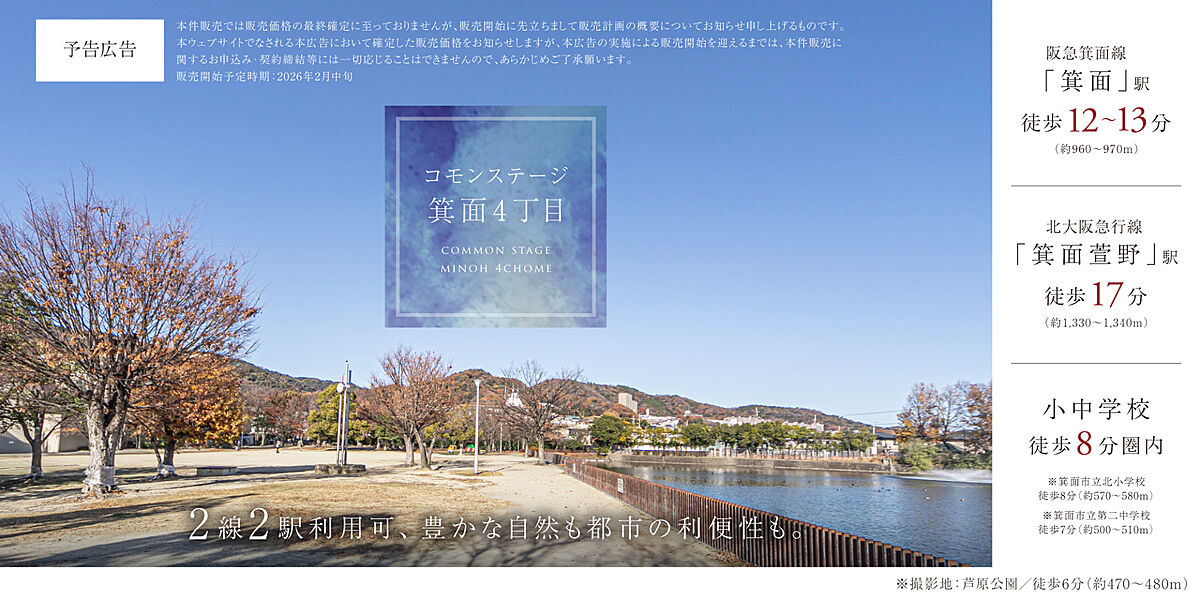 阪急箕面線の始発駅、「箕面」駅まで徒歩12~13分。北大阪急行線「箕面萱野」駅も徒歩圏内にあり、2路線2駅が利用できる立地。買い物・医療・教育施設も徒歩9分圏内に揃います。