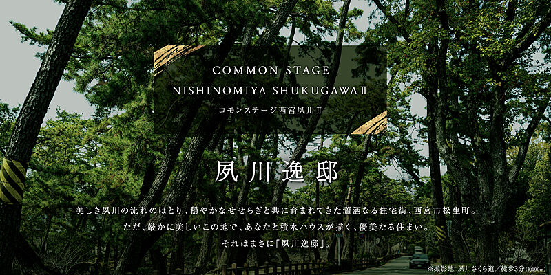 「夙川」駅まで徒歩7分。「神戸三宮」駅と「大阪梅田」駅へダイレクトアクセスが可能。松の緑と桜のピンクが織り成す、夙川の美しい春の風景を身近に楽しめるロケーションに、64坪超の邸宅用地を販売中です。