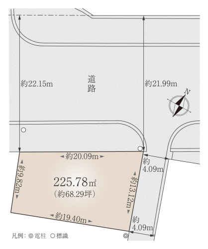 68坪超の開放的な角地を販売中。北側道路の幅員は21m超。向かいの建物と距離を保つことができるため、採光・通風を確保しやすい敷地です。※将来にわたり採光・通風を保証するものではありません。