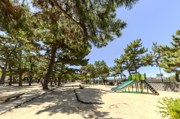 芦屋川沿いにある公園。ブランコ、滑り台などの遊具やテニスコート...