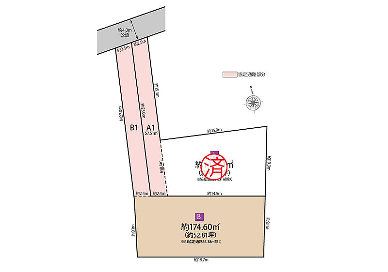 | 建物面積 | - | 土地面積 | B区画:174.60m2(他に協定通路部分55.38m2有) |