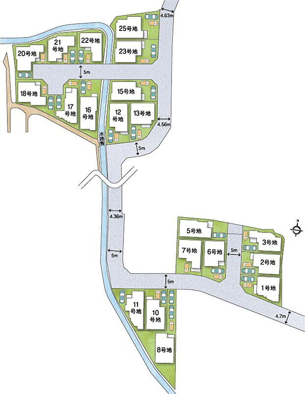 | 駐車場 | カースペース1~2台分(車種による)※区画により駐車台数が異なります。 | 道路の幅員 | 小山113号線:約3.9m~4.7m、開発地内:開発道路約5.0m |