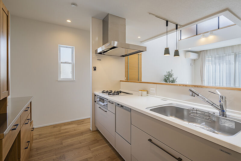 リビング全体を見渡せるアイランドキッチン。ご家族やゲストとゆったりお料理を楽しめる仕様です。便利なグリル付き3口ガスコンロ&食器洗乾燥機付きです。