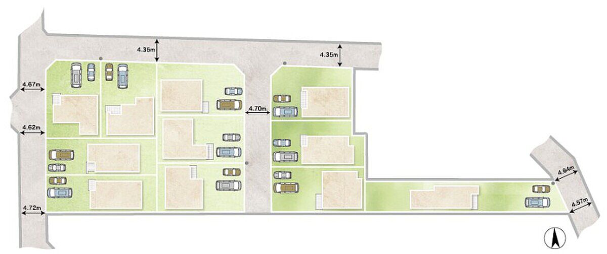 | 駐車場 | 全区画2台分の駐車スペースを確保可能(車種による) | 道路の幅員 | 位置指定道路:幅員約4.35m、開発内道路:幅員約4.72m、私道負担あり28m2~30m2 |