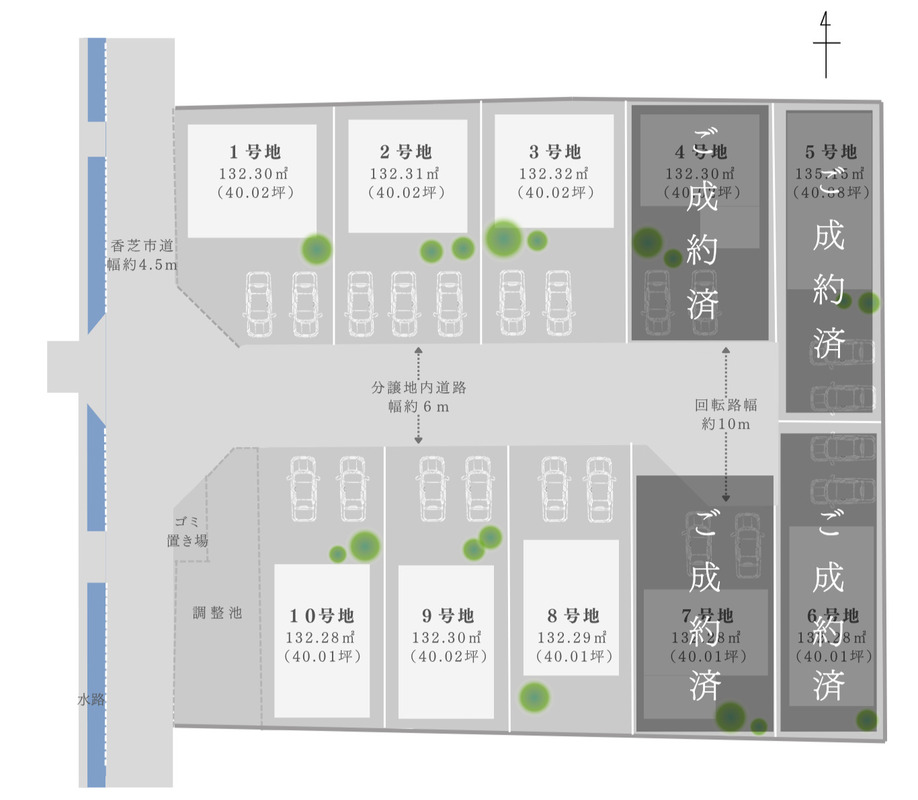 | 駐車場 | 2台 ~ 3台 | 道路の幅員 | 開発道路約6m~10m、西側約4.5m |