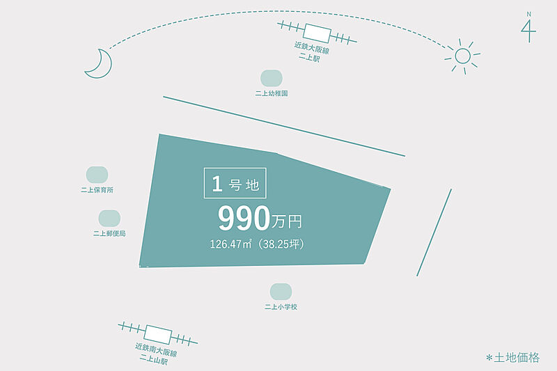 近鉄大阪線二上駅徒歩9分、近鉄南大阪線二上山駅徒歩5分。幼稚園まで徒歩1分、小学校は徒歩3分の好立地