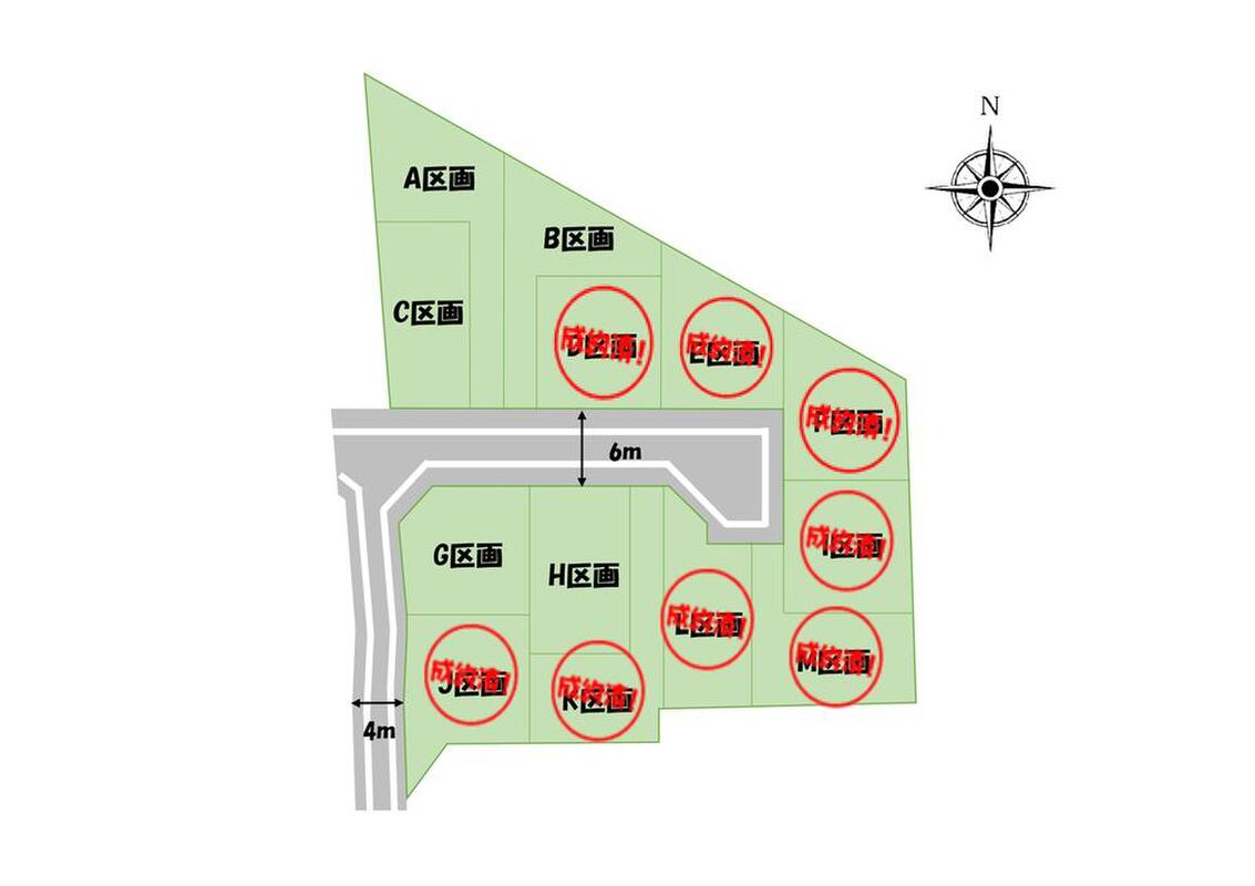 | 駐車場 | - | 道路の幅員 | 道路幅:6m、アスファルト舗装、北側・南側6m開発道路 |