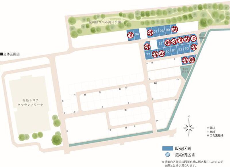 | 備考 | 仁井田下川原地区計画●事業主:(株)日本土地企画、(有)ミノワ●全103区画【うち、積水ハウス分29区画・総戸数29戸(うち建売6戸)】●農地転用許可番号/福島県指令福農委5-1第41号(令和4年9月28日付)●市道幅員/6.0m~9.0m アスファルト舗装●徒歩分数は分速80mで算出しています。●良好なまちなみの形成を図るため、「コモンステージ仁井田《桜づつみサウススクエア》まちなみガイドライン」が制定されています。●開発許可番号:福島市指令開開第36号(令和4年9月28日)/福島市指令開開第22号(令和5年8月28日)(変更許可)●開発行為に関する工事の検査済証:5開開第85号(令和5年10月16日)●水道負担金:13mm/66000円(税込)20mm/165000円(税込)それぞれ別途手数料5800円がかかります。●宅建業法33条に規定する許可等の処分の番号/●開発許可番号:福島市指令開開第36号(令和4年9月28日)/福島市指令開開第22号(令和5年8月28日)(変更許可)●開発行為に関する工事の検査済証:5開開第85号(令和5年10月16日)●本分譲地の土地売買契約は、契約締結後3ヶ月以内に売主である積水ハウス株式会社との間で建築工事請負契約が成立することを条件として効力を生じます。期限までに、建築工事請負契約が成立しなかったときは、土地売買契約の無効が確定し、受領済の手付金等は、全額無利息にてすみやかに返還いたします。 | ||