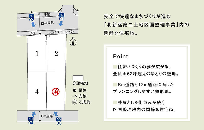 | 駐車場 | - | 道路の幅員 | 道路幅:6m~12m/道路幅の備考:1・2号地道路幅員12m(歩道含む)3・4号地道路幅員6m |