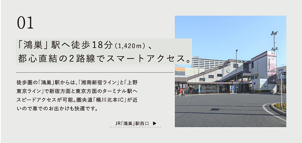 【生活環境が整うまち】日常のお買い物に便利なショッピングセンターまで徒歩6分整備された遊具がある鴻巣公園や清水こども医院も徒歩圏内に揃う。東京や池袋などの主要駅まで乗り換えなしでアクセス