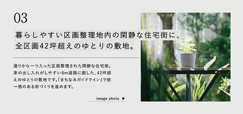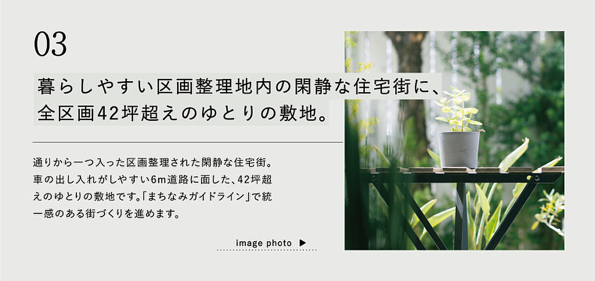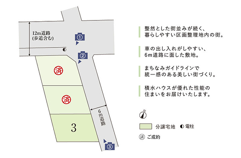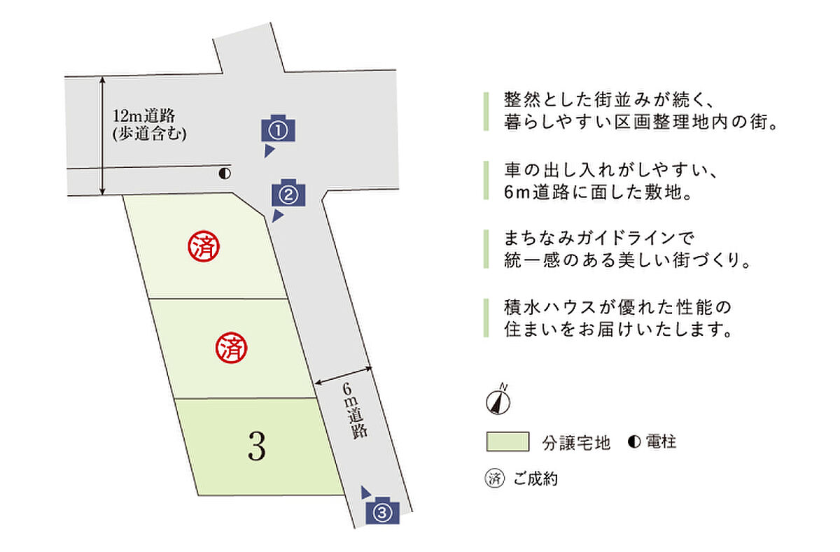 | 備考 | その他制限等/景観誘導区域、宅地造成及び特定盛土等規制法、都市再生特別措置法●水道分担金(209,000円・税込)が別途必要です。●良好なまちなみの形成を図るため、「まちなみガイドライン」を作成しています。※先着順販売の為、売約済みの場合がございます。予めご容赦ください。※坪表示は1m2=0.3025坪で換算し、小数点第3位以下は切り捨てとしました。※徒歩分数は80m/1分で算出(1分未満は切り上げております)車・自転車の所要時間は実走の場合です。●本分譲地の土地売買契約は、契約締結後3ヶ月以内に売主である積水ハウス株式会社との間で建築工事請負契約が成立することを条件として効力を生じます。期限までに、建築工事請負契約が成立しなかったときは、土地売買契約の無効が確定し、受領済の手付金等は、全額無利息にてすみやかに返還いたします。 | ||