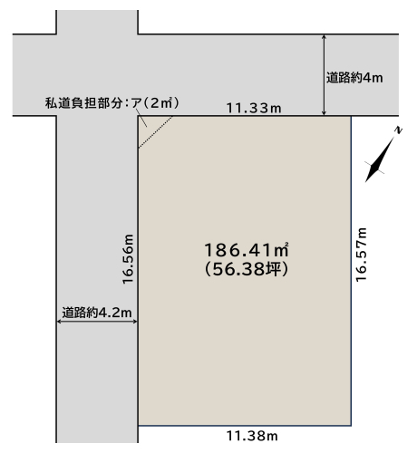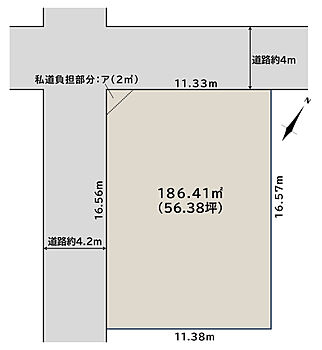 | 建物面積 | - | 土地面積 | 186.41m2私道負担有り別途隅切り2m2(ア部分) |