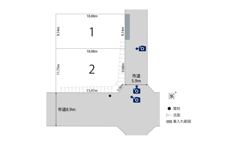 | 駐車場 | - | 道路の幅員 | 道路幅:5.9m~8.9m/道路幅の備考:南東側8.9m、北東側5.9m |