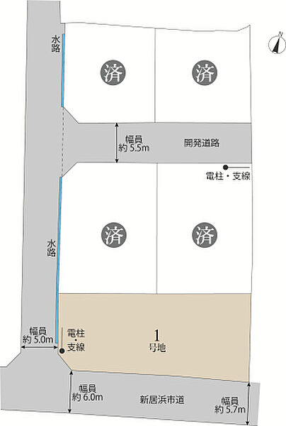 | 主たる設備の概要 | ●上水道/新居浜市公営水道●雨水/西側水路に放流●汚水・雑排水/公共下水●電気/四国電力(株)●ガス/個別プロパンガス | 開発許可番号 | 完成済(1) |