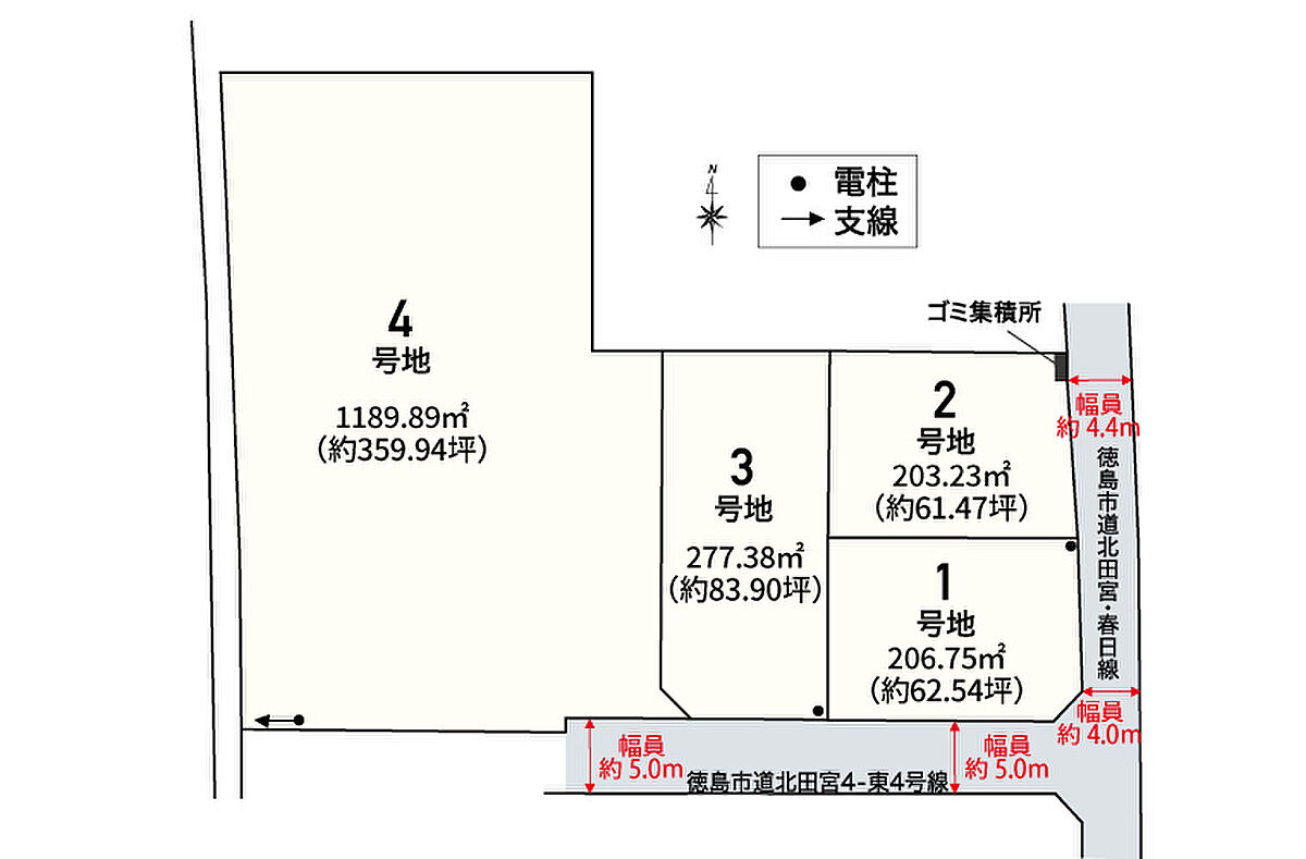 | 備考 | 本分譲地ではよりよい住環境の創造と、美しいまちなみ景観づくりのために、まちなみガイドラインを作成しており、ご協力をお願いしております。(なお、4号地は対象外となります。)※私道負担:なし●負担金/水道加入金他:水道加入金他(税込)179,000円(口径25mmの場合)●CATV/加入必要、宅内工事費用:概ね20,000円(税込)前後、引込工事負担金:16,500円(税込)、月額利用料:2,090円~6,600円(税込)※プランやオプションによって異なります。●開発総面積:1910.41m2 ●農地転用番号:市農委発第5518号(令和7年3月5日)●開発許可番号:徳市開第070号(令和7年3月10日)徳市開第019号(令和7年7月14日)変更●本分譲地の土地売買契約は、契約締結後3ヶ月以内に売主である積水ハウス株式会社との間で建築工事請負契約が成立することを条件として効力を生じます。期限までに、建築工事請負契約が成立しなかったときは、土地売買契約の無効が確定し、受領済の手付金等は、全額無利息にてすみやかに返還いたします。 | ||