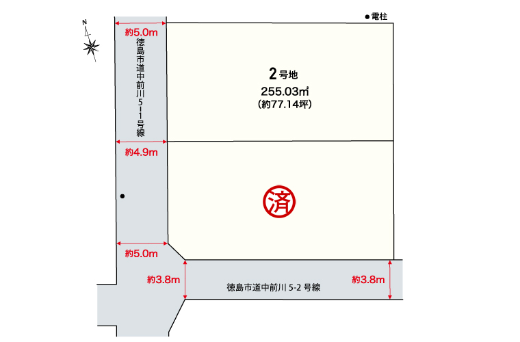 | 駐車場 | - | 道路の幅員 | 道路幅:3.8m~5m/道路幅の備考:西:徳島市道(幅員約4.9m~5.0m) 南:徳島市道(幅員約3.8m)(アスファルト舗装) |