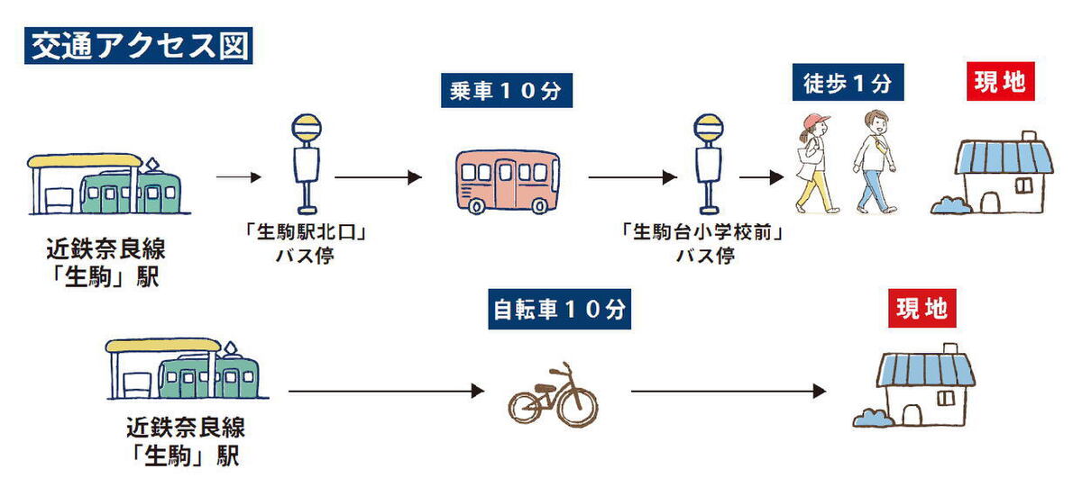 近鉄奈良線「生駒」駅 バス10分「生駒台小学校前」バス停 徒歩1分 近鉄生駒ケーブル線「鳥居前」駅 徒歩31分 近鉄奈良線「東生駒」駅 徒歩31分 |