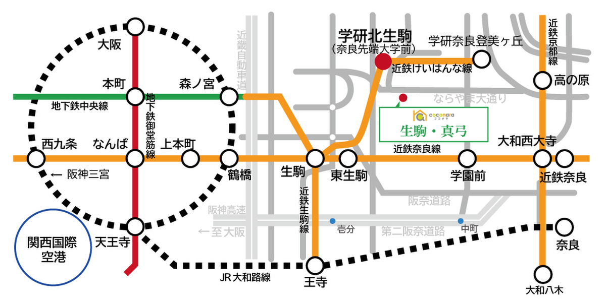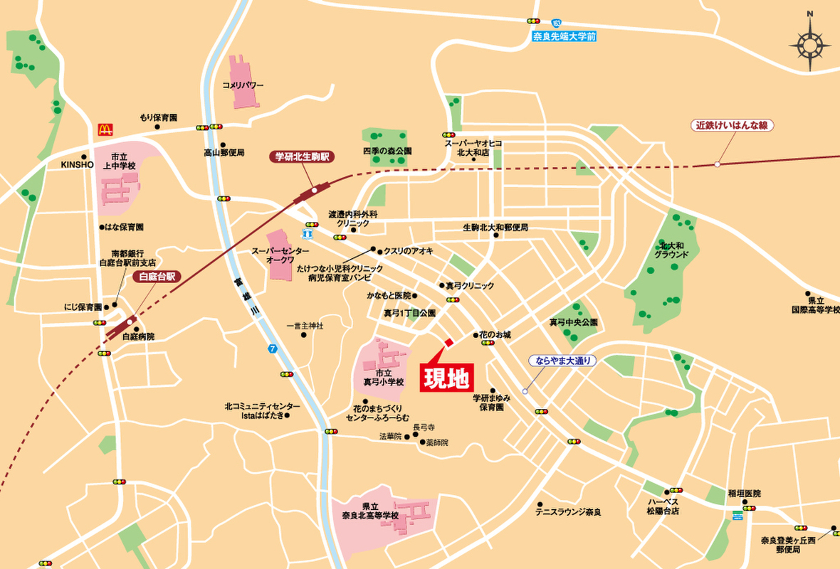 近鉄けいはんな線「学研北生駒」駅 徒歩10分 近鉄けいはんな線「白庭台」駅 徒歩20分 近鉄けいはんな線「学研奈良登美ヶ丘」駅 徒歩38分 |