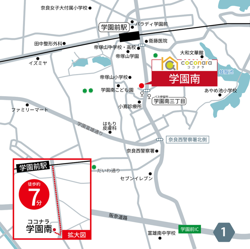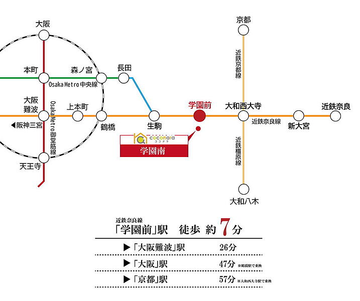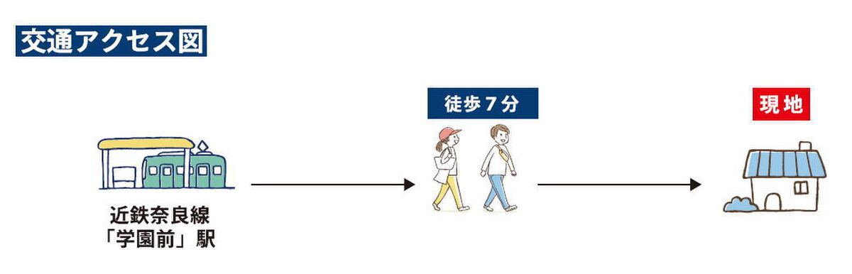 近鉄奈良線「学園前」駅 徒歩7分 近鉄奈良線「菖蒲池」駅 徒歩17分 近鉄奈良線「大和西大寺」駅 徒歩43分 |
