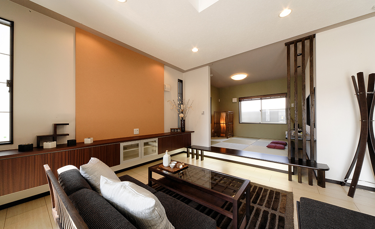 リビングと和室を開放すると広々とした大空間に。段差部分に腰をかけてくつろぐことができる、小上がり和室を採用しました。段差を設けることで、和室にほこりやゴミが入り込むのを防げます。