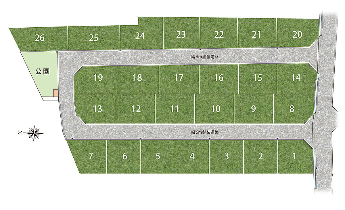 総26区画!約6m幅の見通しの良い街区内道路から風や光が届きます。街区の一番奥に公園があるため交通量が少なく、のどが渇いてもお子様がすぐに帰宅できる距離です。