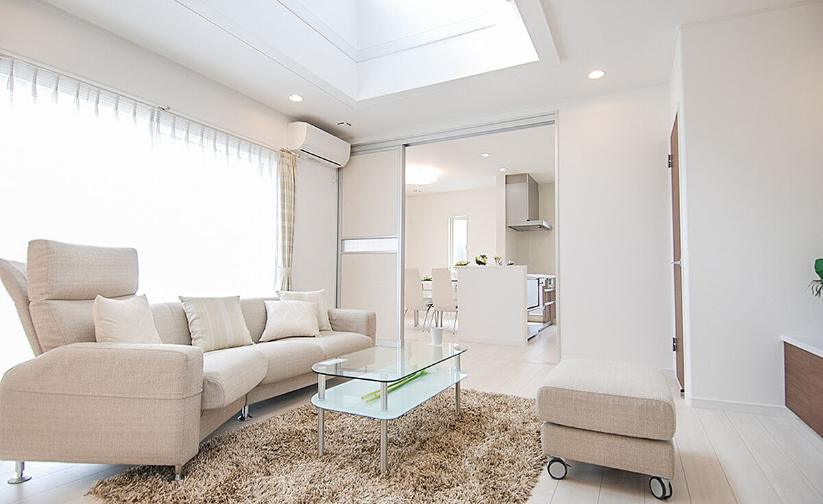 大きな掃き出し窓に面した、明るく開放的なリビング・ダイニングです。明るい自然光が注ぐリビングでくつろぐだけでも充実した休日を過ごせる住まいです。