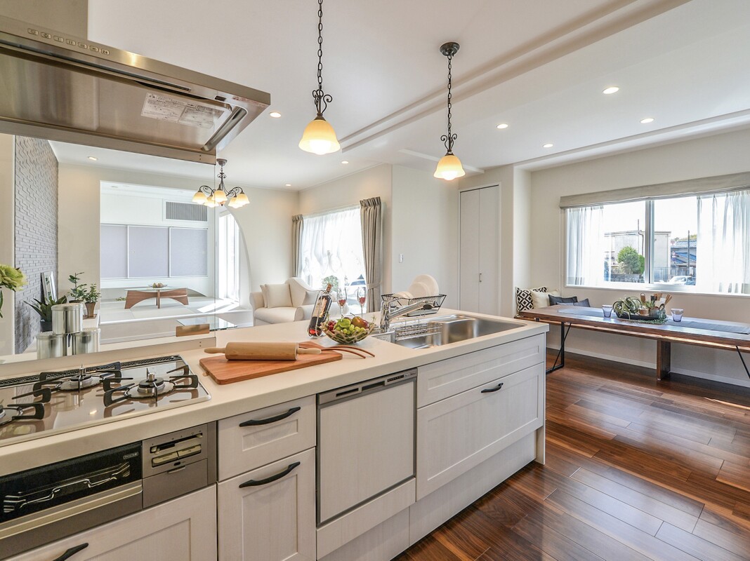 キッチンやリビング、ダイニングなど、どこにいても家族の様子が分かる、一体感のあるLDKです。フローリングの木の優しい色合いと白い壁がリラックスできる空間を演出してくれます。