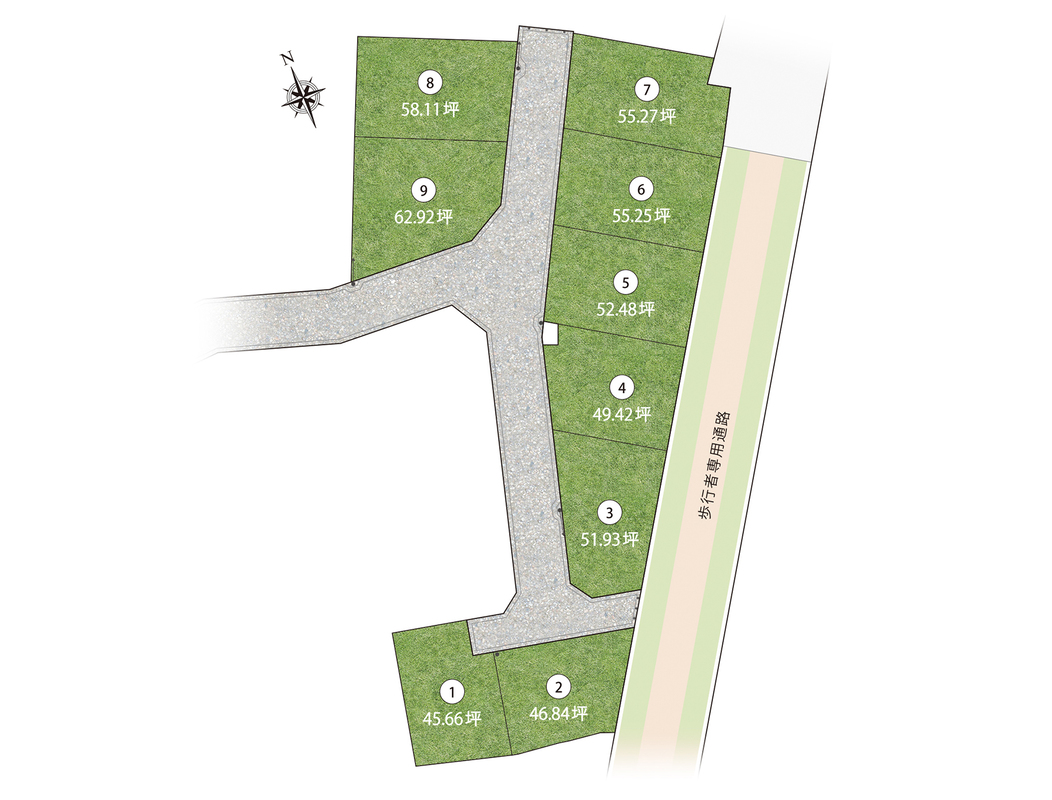 ・分譲地東側は約10m幅の歩行者専用道路に面し、風通しがよく穏やかな街。