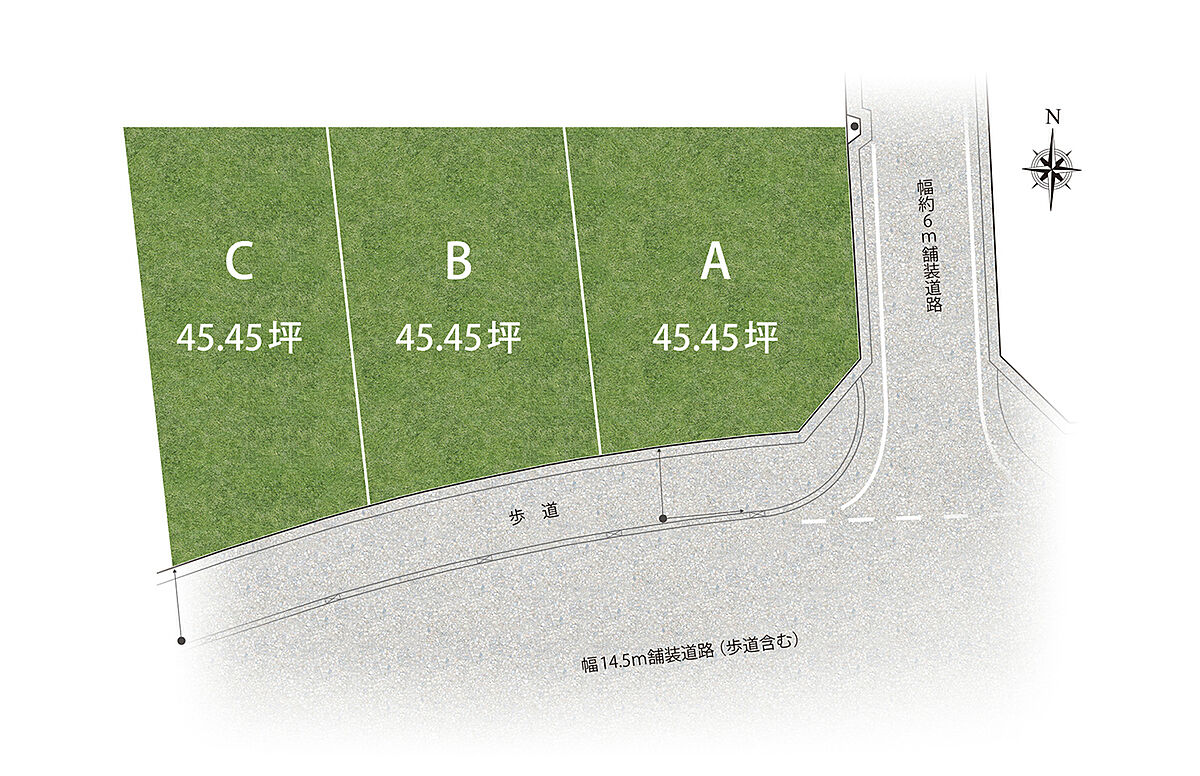 全3区画が南道路に面し、45坪超で広々!採光を確保しやすく、歩道が整備されており、徒歩でのお出掛けも安心です。すぐ南側には姫路バイパスが東西に伸びており、車通勤のご家庭にも◎