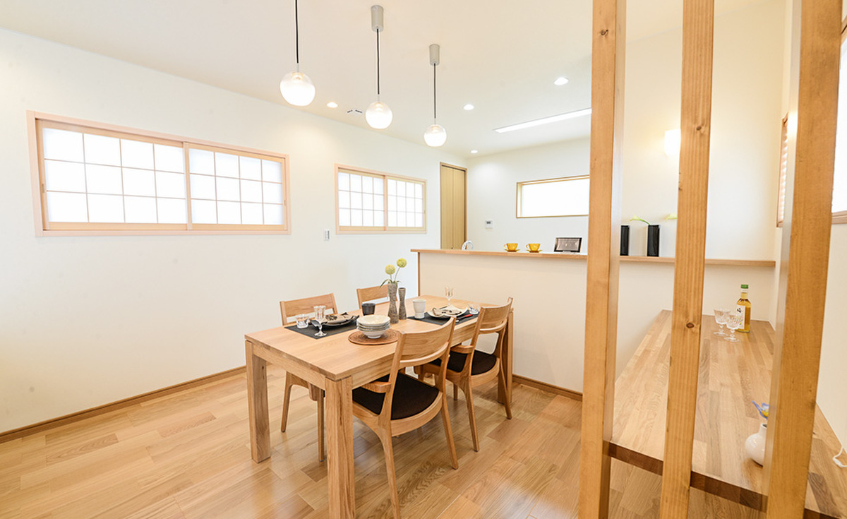 3連のペンダントライトがお洒落な明るいダイニングです。格子状の窓が和風モダンな雰囲気を出しており、どの年代のご家族も落ち着いて過ごしていただけます。