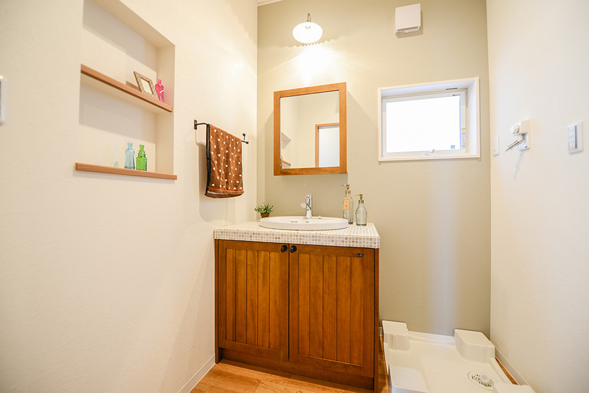 タイルをポイントにした可愛い洗面台です。小物類もスッキリ収納可能でコンパクトながら機能性も兼ね備えております。小窓からは換気もでき、心地よい風が入ってきます。