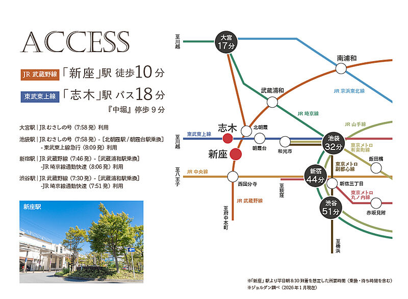 - JR武蔵野線「新座」駅 徒歩9分東武東上線「志木」駅 バス18分「中堀」バス停 徒歩9分東武東上線「朝霞台」駅 バス10分4「新座警察署前」バス停 徒歩13分