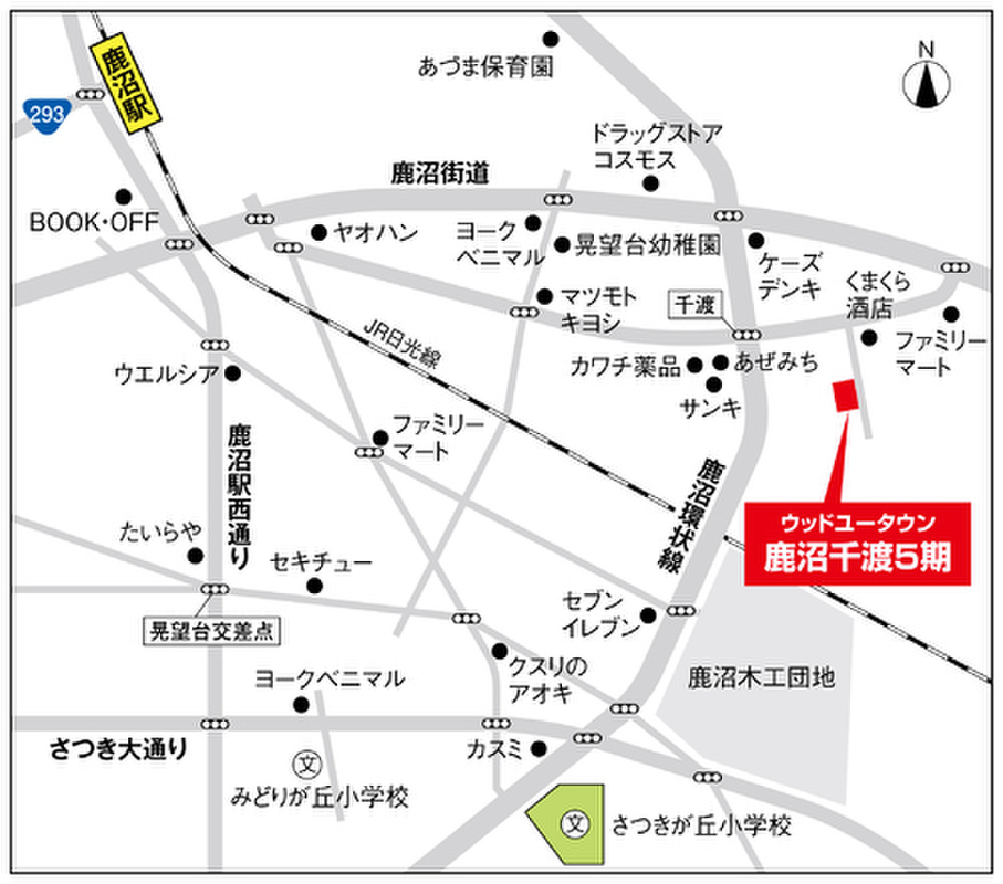 鹿沼駅まで3060m(車で約11分)、鹿沼街道まで600m(車で約2分)でアクセスしやすい立地。