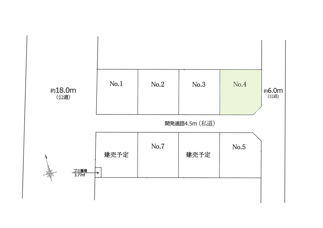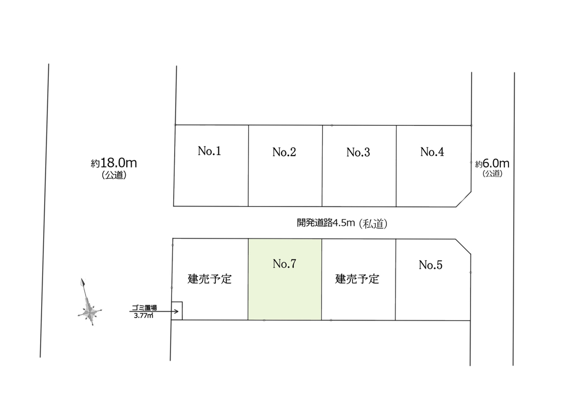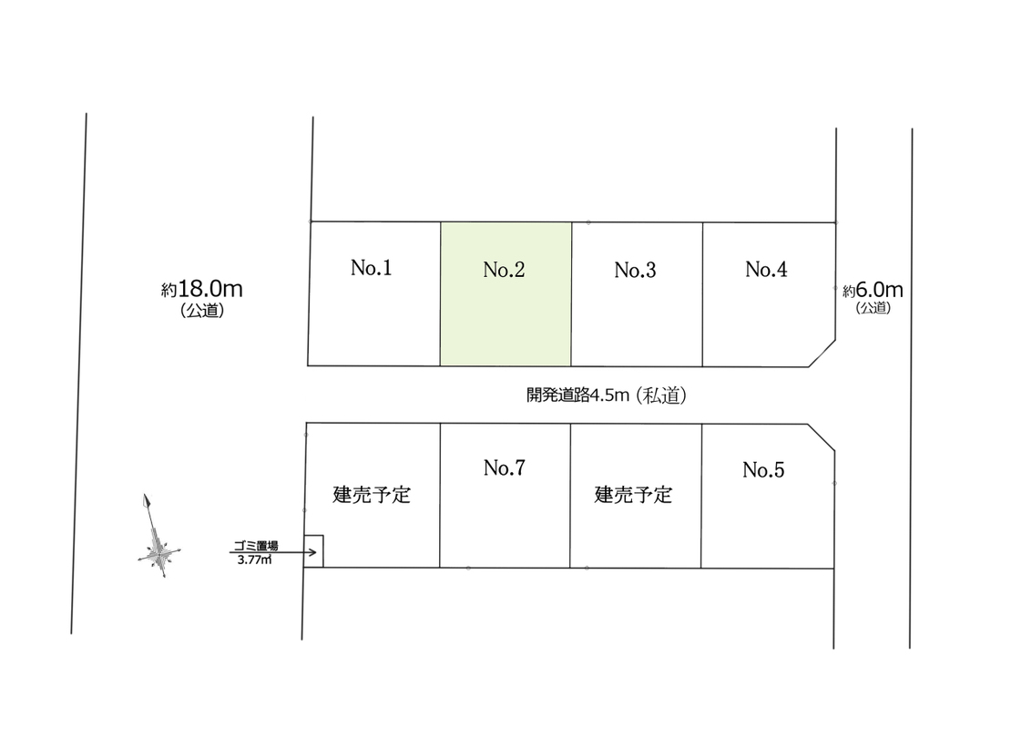 | 駐車場 | - | 道路の幅員 | 北西側約18m、南東側約6m、開発道路約4.5m(私道持ち分191.90m2の1/8) |