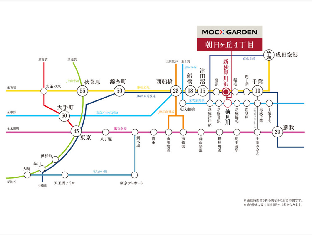 JR総武線「新検見川駅」から「東京駅」まで約47分。「新宿駅」まで約69分。