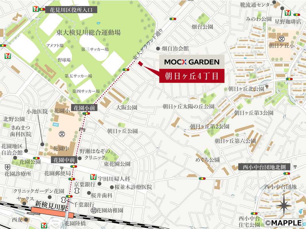 JR総武線「新検見川」駅 徒歩12分 最寄り約110m(徒歩約2分)朝日ヶ丘バス停から京成バス利用で、JR総武線新検見川駅北口バス乗り場まで約750m(約4分) 京成千葉線「検見川」駅 徒歩23分 京成バス「朝日ヶ丘」 徒歩2分 |