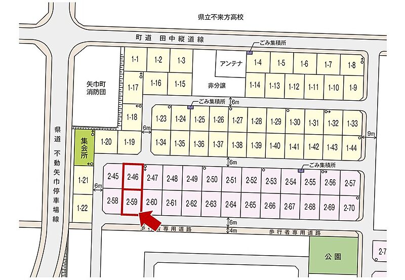 | 駐車場 | - | 道路の幅員 | 区画2-46:北側6m、区画2-59:南側6m |