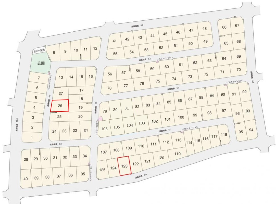 | 駐車場 | 1台 ~ 2台 | 道路の幅員 | 南側8m(123号地)、西側6m(26号地) |