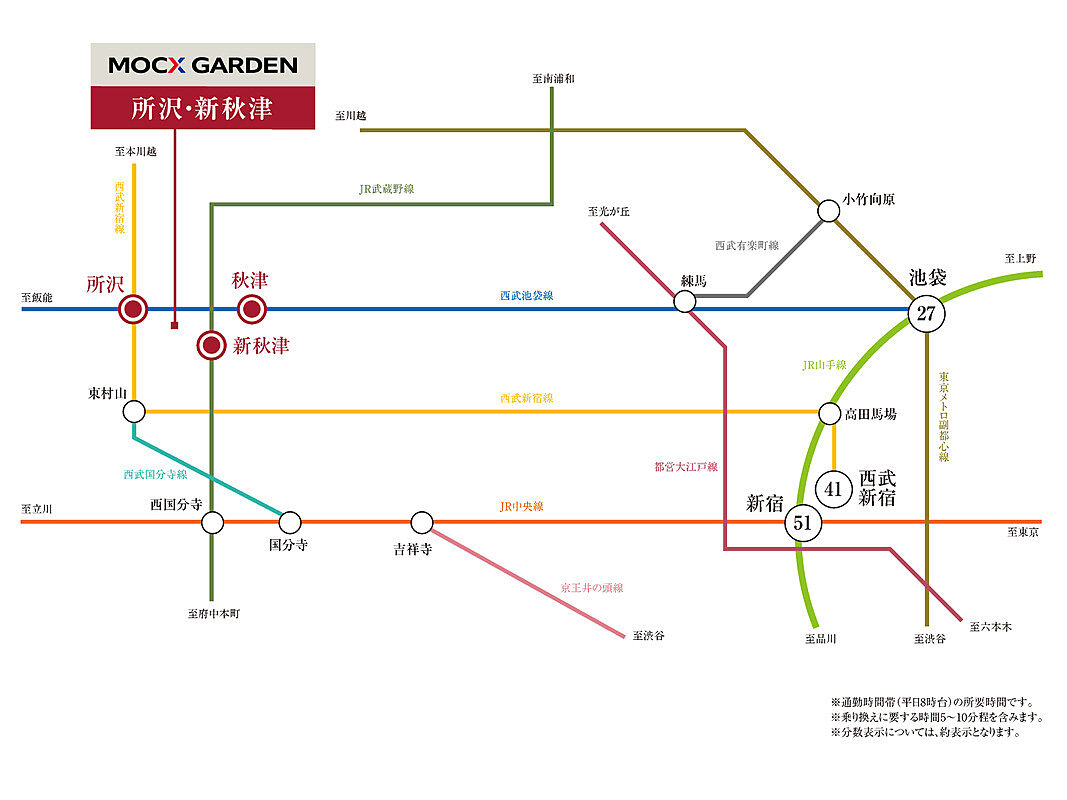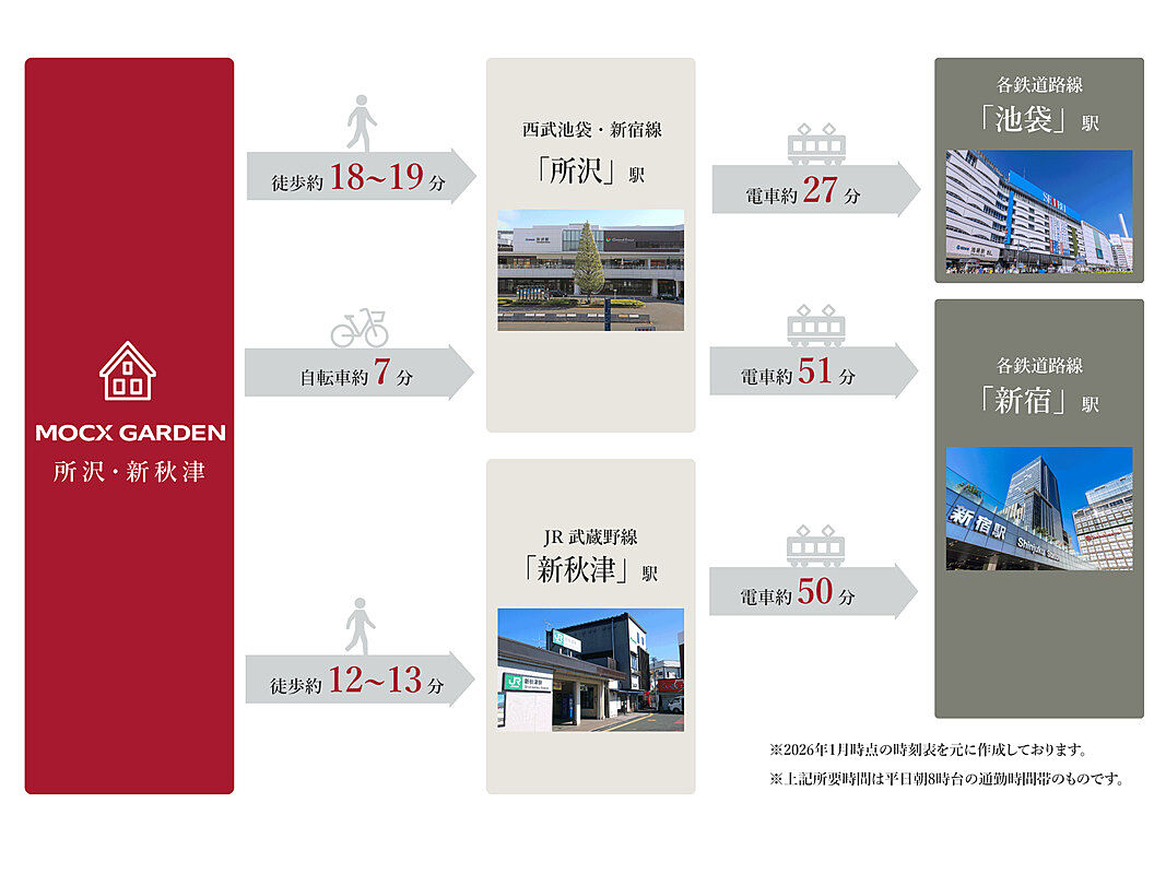 西武池袋線「所沢」駅 徒歩18分~19分 JR武蔵野線「新秋津」駅 徒歩12分~13分 西武池袋線「秋津」駅 徒歩17分~18分 |