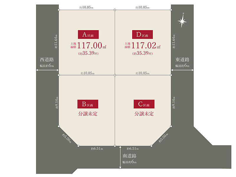 | 建物面積 | - | 土地面積 | 117.02m2(A区画、D区画)~121.15m2(B区画、C区画) |