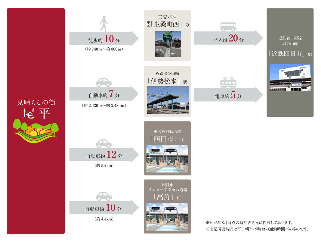 近鉄名古屋線「近鉄四日市」駅 三交バス20分「生桑町西」バス停 徒歩10分 近鉄湯の山線「伊勢松本」駅 徒歩31分 |