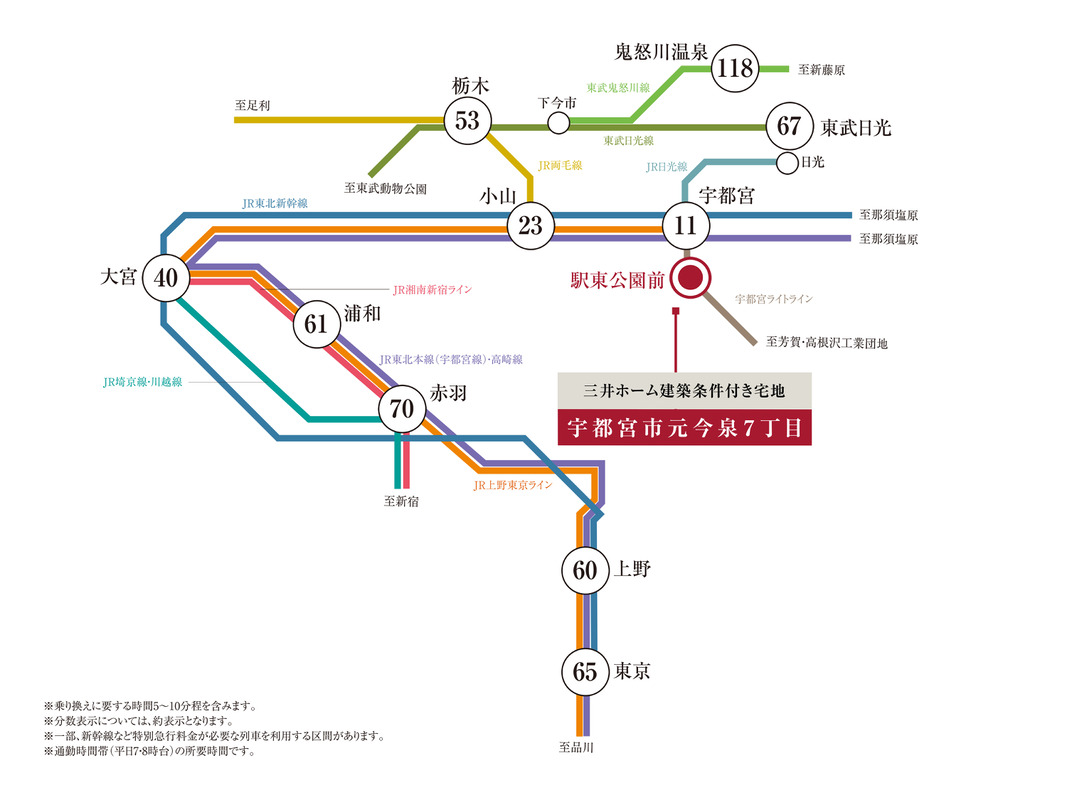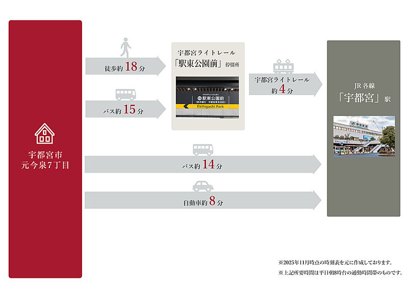 - JR東北本線「宇都宮」駅 徒歩24分宇都宮芳賀ライトレール線「駅東公園前」駅 徒歩18分