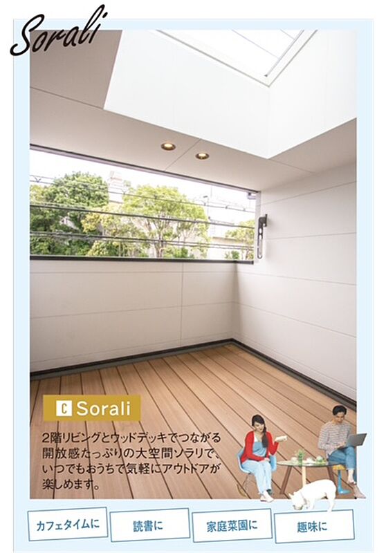 空がよく見え、太陽が降り注ぐウッドデッキのある家