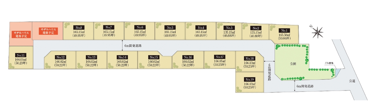 全19区画、日当たりの良い閑静な高台に広がる大型分譲の区画。開発6m道路を新設した陽光降りそそぐ開放感のある街区設計です。