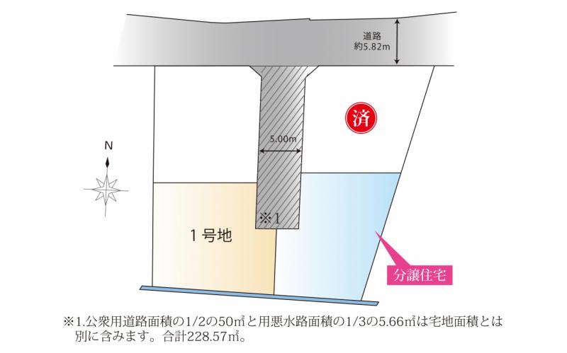 1号地は公衆用道路面積の1/2の50m2と用悪水路面積の1/3の5.66m2は宅地面積172.91m2とは別に含みます。(合計228.57m2) 公衆用道路は1号地と3号地の共有持分で1号地の北側の方・1号地・2号地・3号地の通行地役権と上下水道の地役権を設定致します。 1号地と3号地の南側用悪水路は1号地・3号地・1号地西側の方との共有所有の水路です。 |