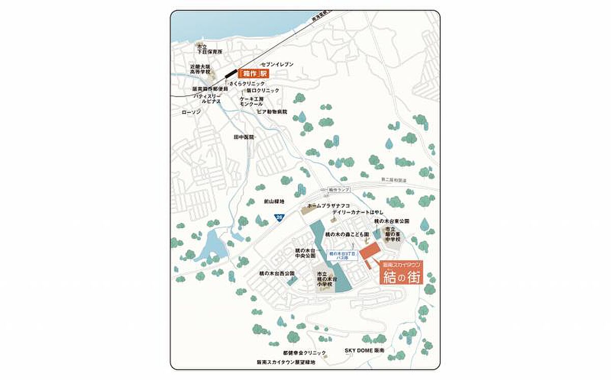 タウン内には、スーパー「デイリーカナートはやし」やホームセンター「ホームプラザナフコ」から、小中学校、医療施設、公園までが揃い、住まう方々に快適な生活環境を提供。また南海本線「箱作」駅周辺に集まる生活裏面施設も気軽に利用できます。