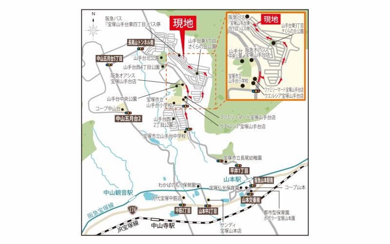 阪急宝塚本線「山本」駅 バス乗車11分、宝塚山手台東四丁目バス停 徒歩2分 |