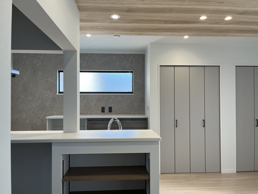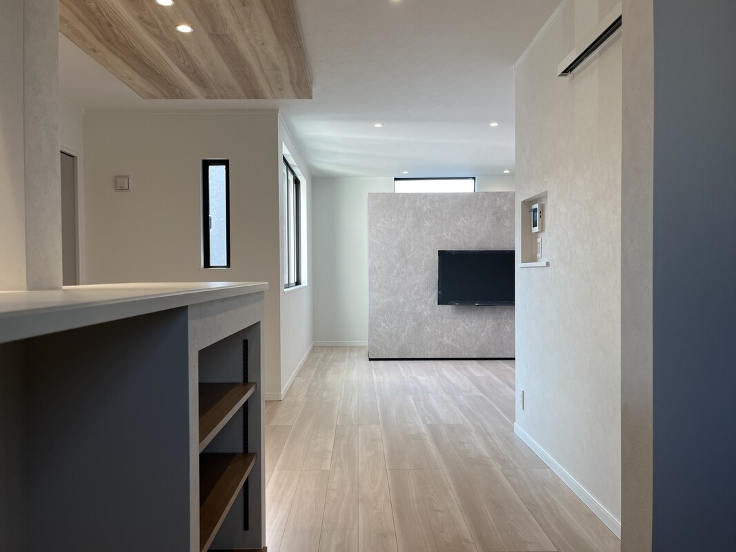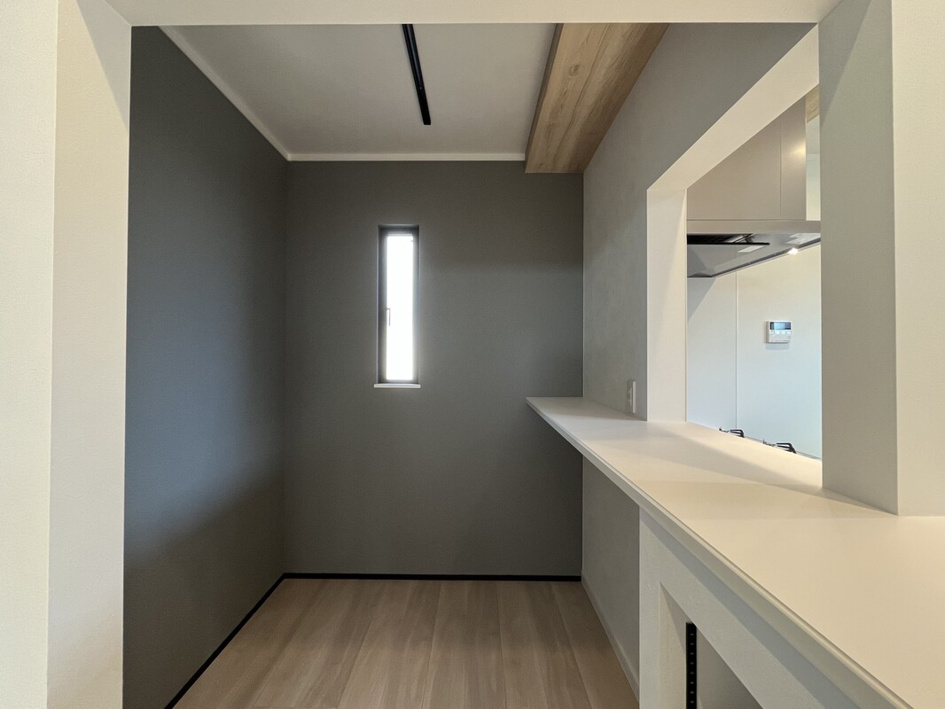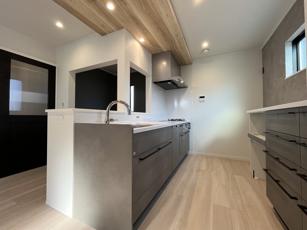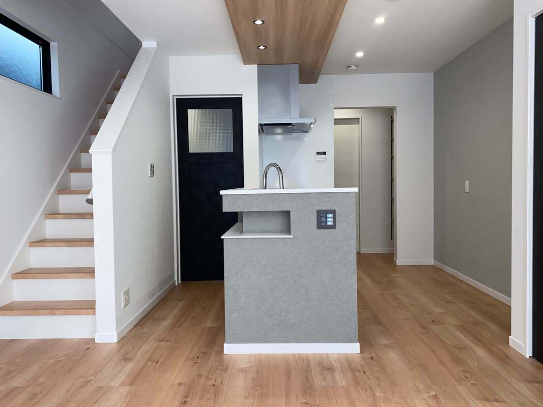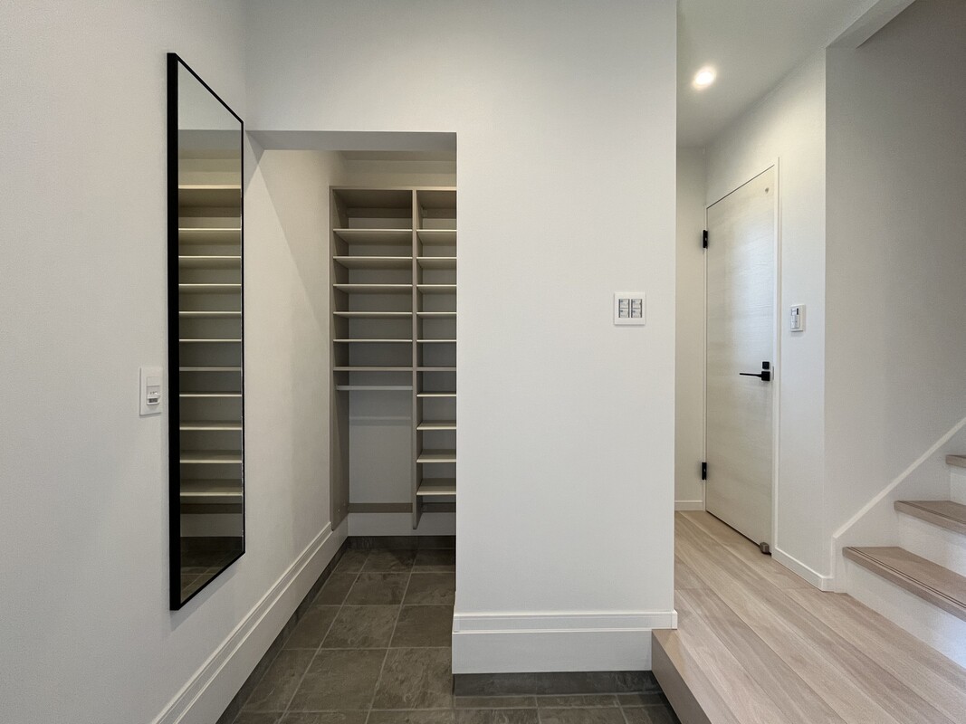 動線にも注目!玄関→パントリー→キッチン→リビング→玄関、とぐるりと一周できる回遊動線もこだわりポイント。2階の主寝室へつながる廊下は吹き抜け仕様、家の中でもちょっとしたプライベート感を演出しています。